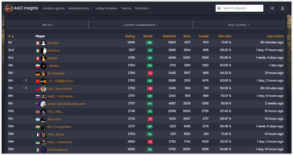 - Player Profiles: Search your name (or your opponent’s) and instantly see rating history, recent matches, and performance across different maps and civs.