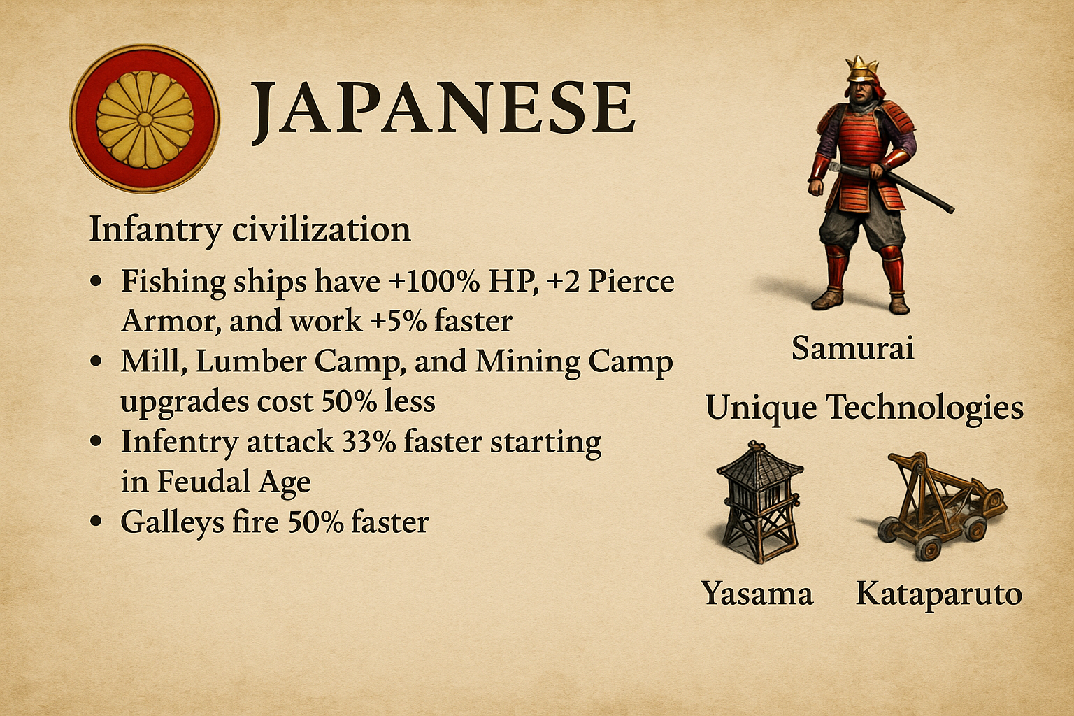 Whether you’re looking to rush your opponent with Men-at-Arms, dominate the seas with unstoppable galleys, or overwhelm the late game with Samurai and Champions, mastering the Japanese civ is a rewarding journey.